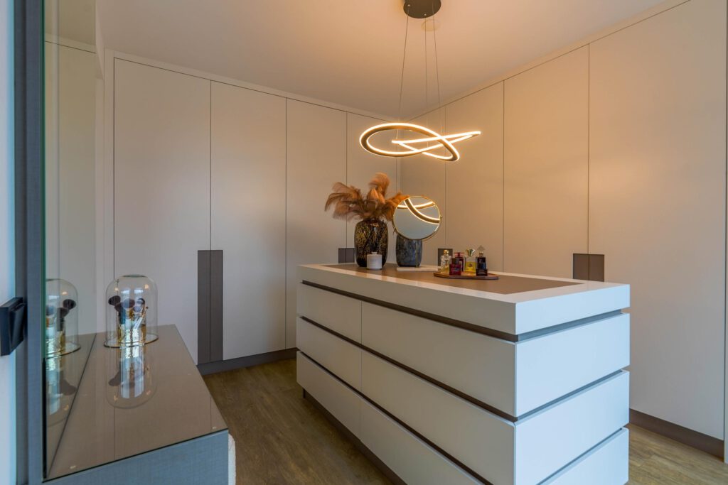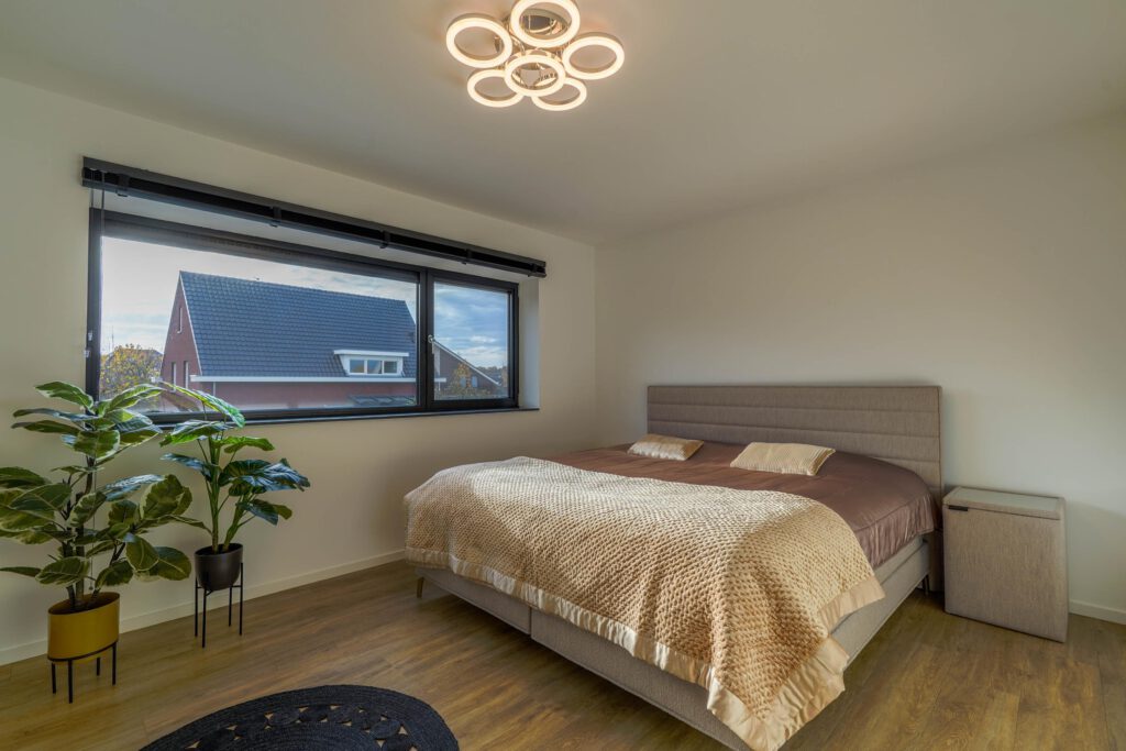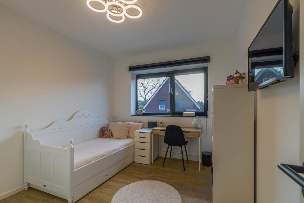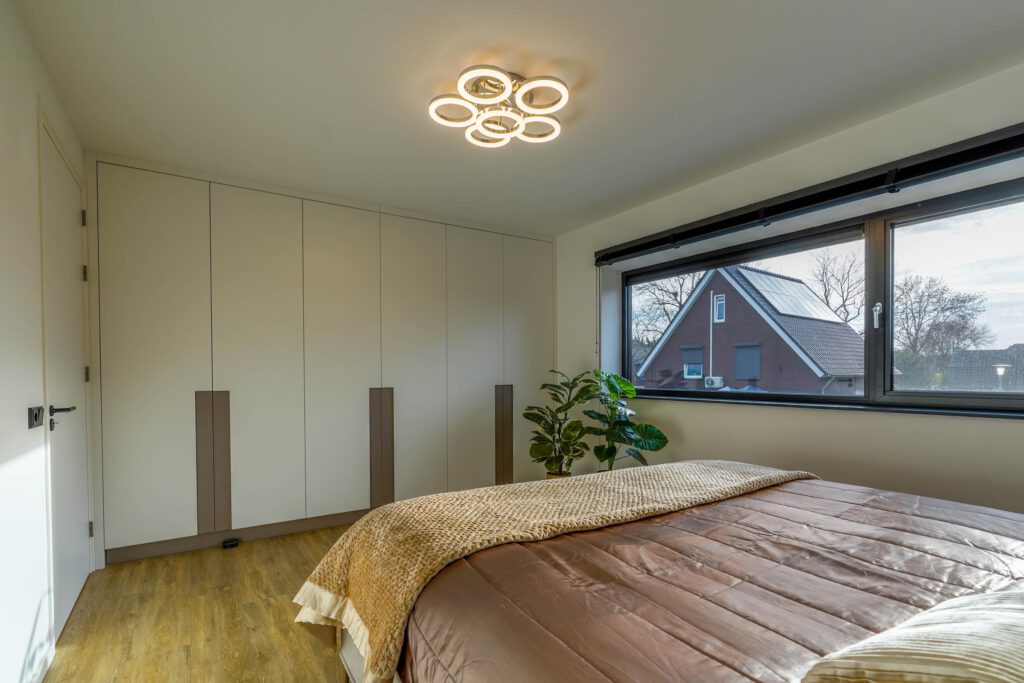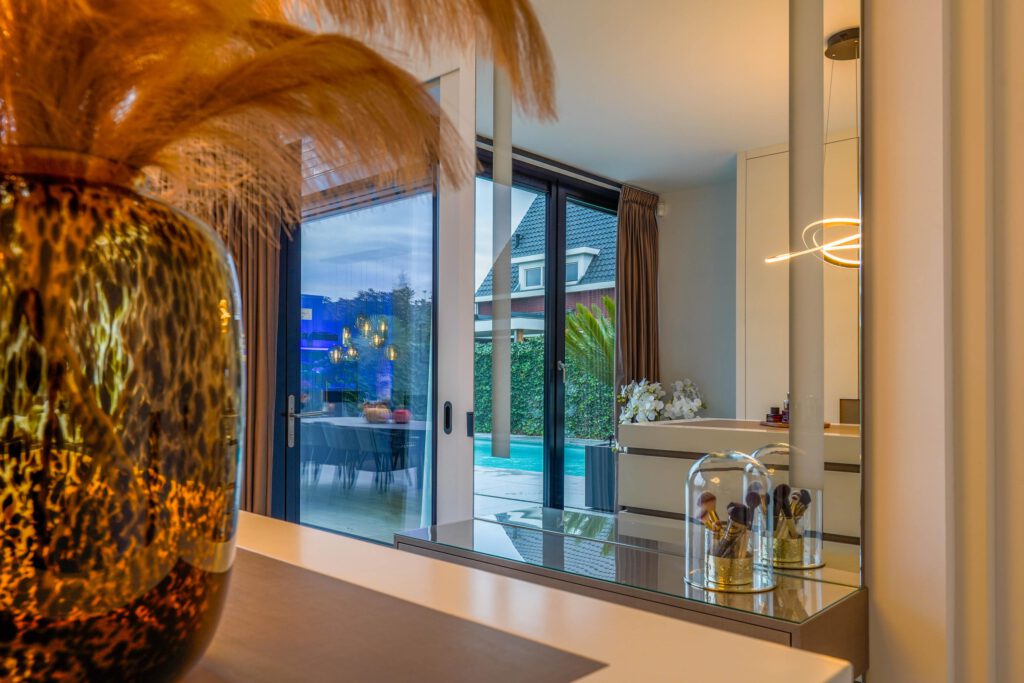 De keuken is uitgevoerd met een groot kookeiland en een volledige kastenwand met hoogwaardige inbouwapparatuur: oven, magnetron, koffiemachine én Quooker. Dankzij de grote raampartijen aan de achterzijde geniet je van bijzonder veel licht en een prachtig zicht op de tuin en het zwembad. De woonkamer biedt voldoende ruimte voor een grote bank en wordt extra sfeervol gemaakt door de moderne gashaard Op de begane grond bevindt zich ook een luxe kledingkamer (afsluitbaar met schuifdeur), compleet met maatwerk inbouwkasten. Aangrenzend ligt een moderne badkamer met inloopdouche, dubbele wastafel met lades en hoogwaardige afwerking. Daarnaast is er een separaat toilet. Deze kamer kan, indien gewenst, worden ingericht als slaapkamer, waardoor de woning levensloopbestendig wordt.