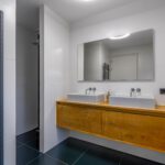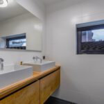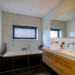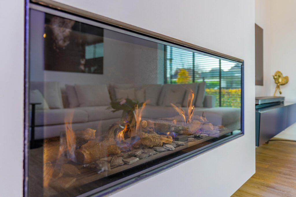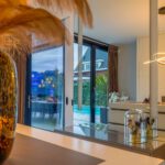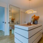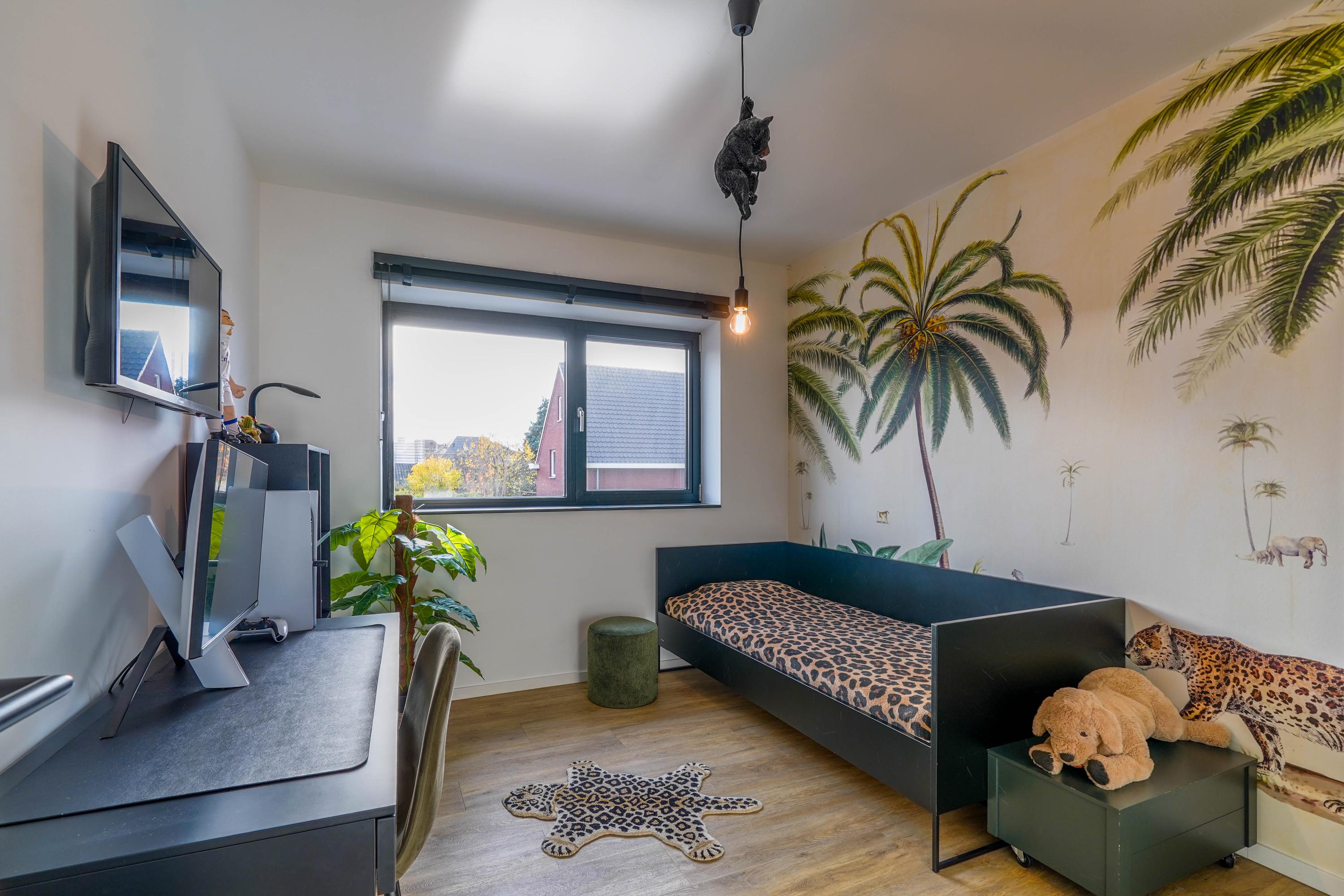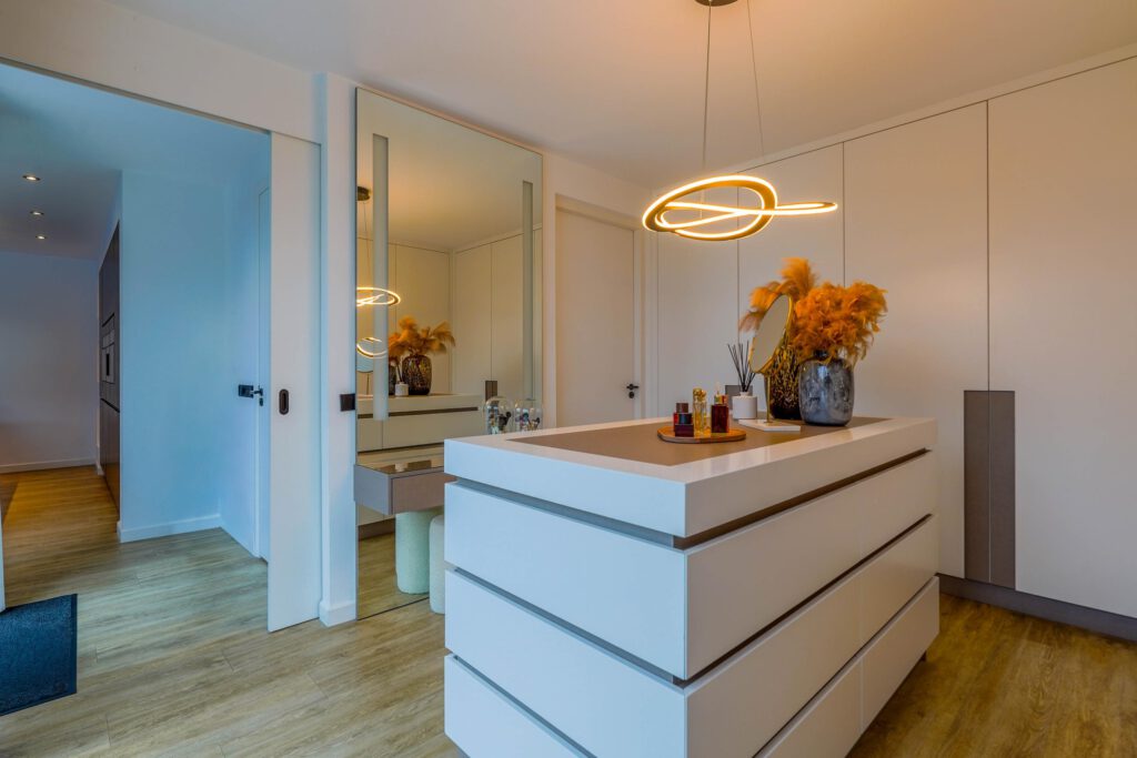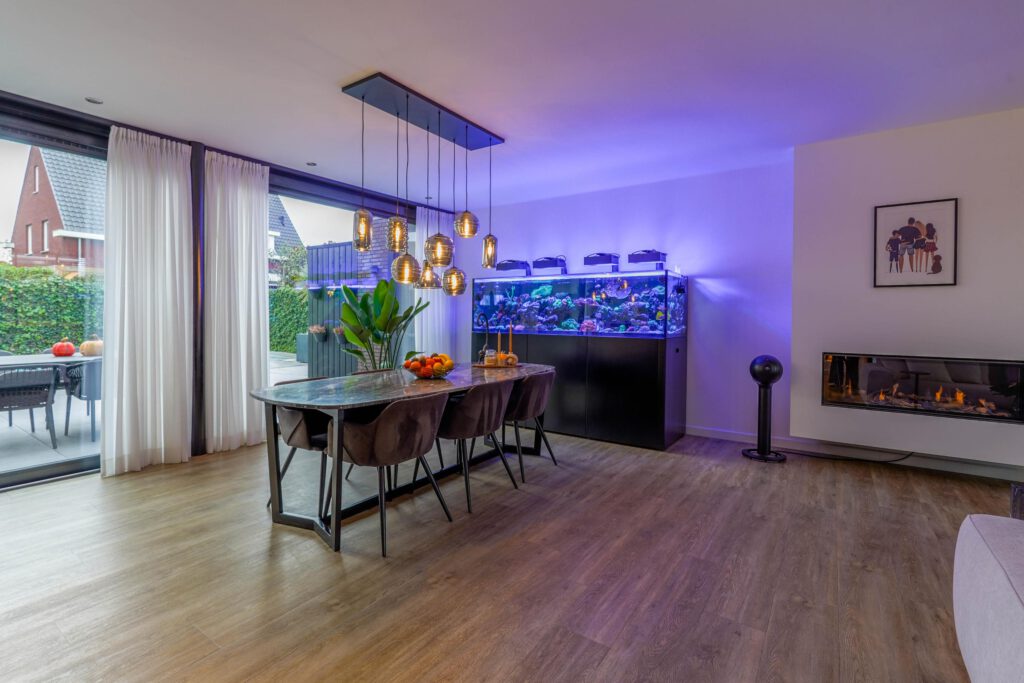 De keuken is uitgevoerd met een groot kookeiland en een volledige kastenwand met hoogwaardige inbouwapparatuur: oven, magnetron, koffiemachine én Quooker. Dankzij de grote raampartijen aan de achterzijde geniet je van bijzonder veel licht en een prachtig zicht op de tuin en het zwembad. De woonkamer biedt voldoende ruimte voor een grote bank en wordt extra sfeervol gemaakt door de moderne gashaard Op de begane grond bevindt zich ook een luxe kledingkamer (afsluitbaar met schuifdeur), compleet met maatwerk inbouwkasten. Aangrenzend ligt een moderne badkamer met inloopdouche, dubbele wastafel met lades en hoogwaardige afwerking. Daarnaast is er een separaat toilet. Deze kamer kan, indien gewenst, worden ingericht als slaapkamer, waardoor de woning levensloopbestendig wordt.