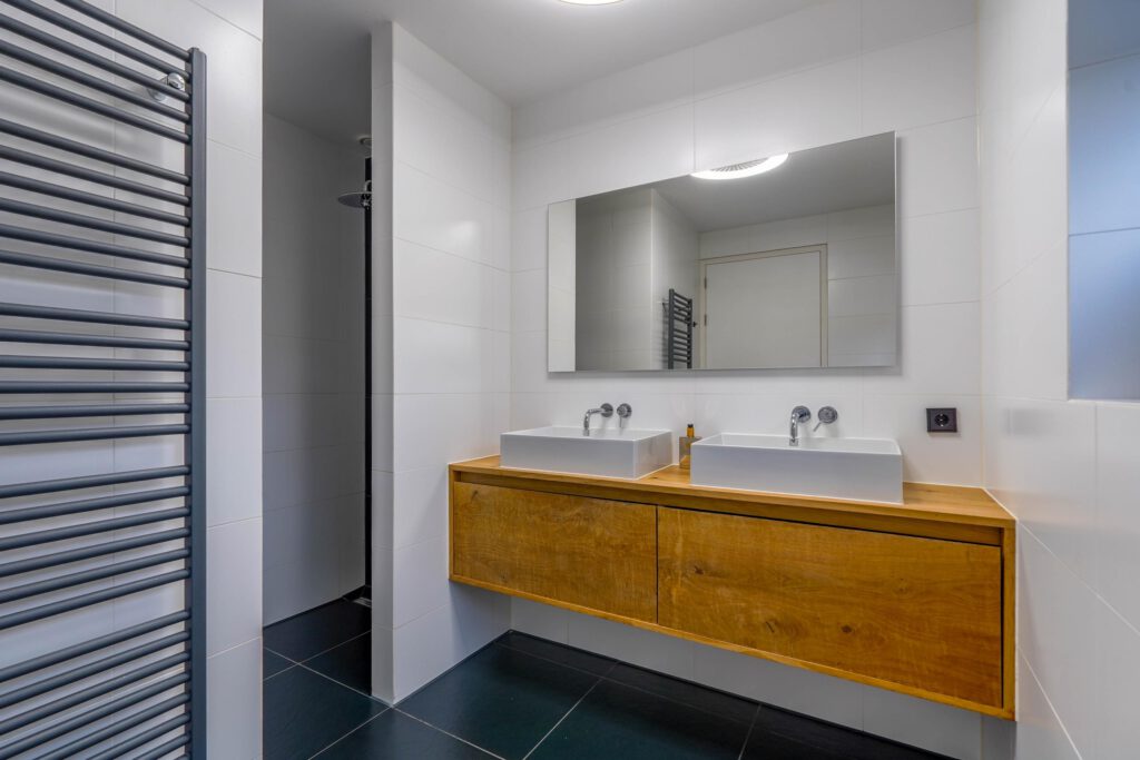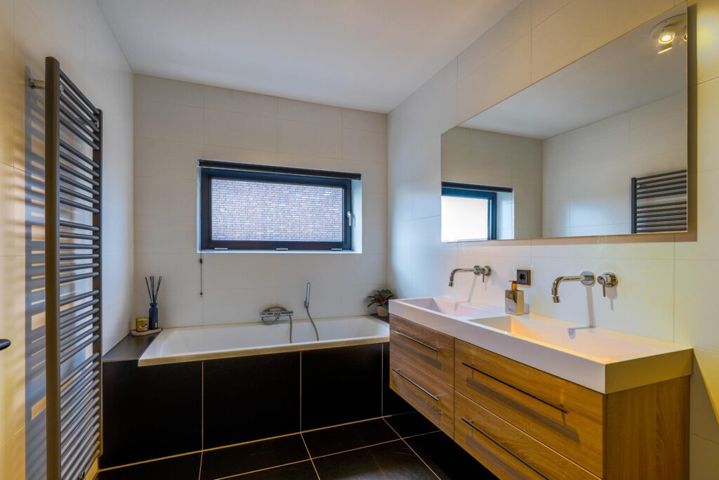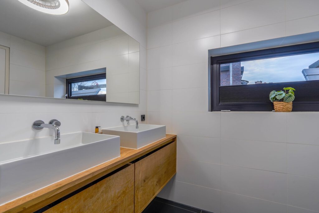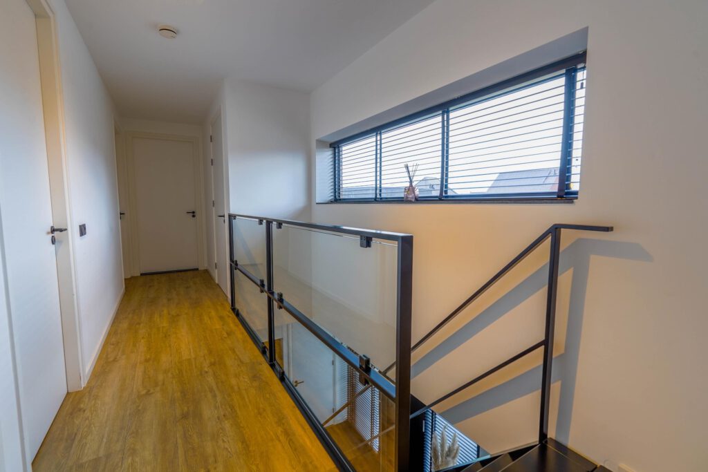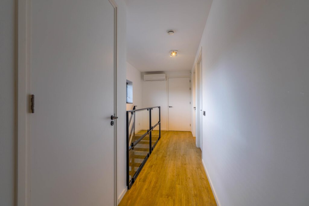 De stalen trap leidt naar een ruime overloop met eveneens een stalen balustrade. Hier zorgt een airco voor een aangenaam klimaat in de warmere maanden. De eerste verdieping beschikt over: drie volwaardige slaapkamers, waarvan één royale master bedroom voorzien van hoogwaardige ingebouwde kasten. De moderne badkamer met ligbad, dubbele wastafel en inloopdouche. Er is een een separaat toilet aanwezig en een praktische bergkast voor extra opslag.