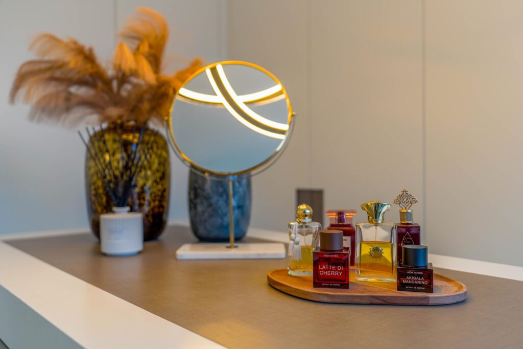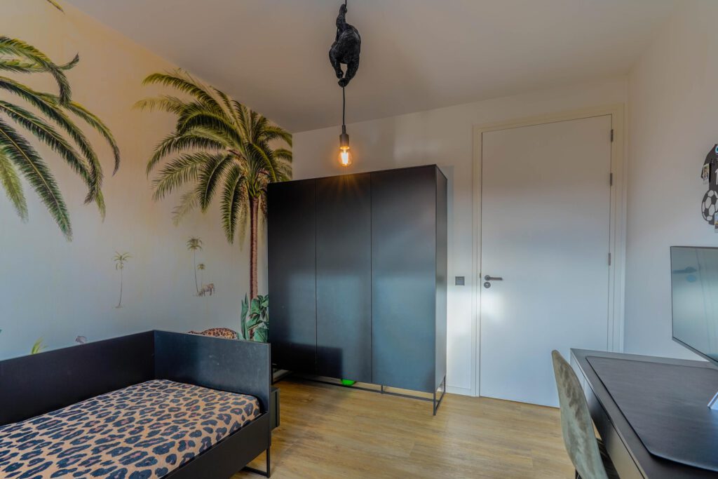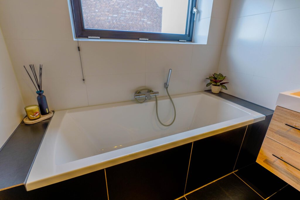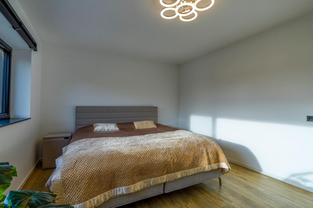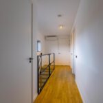 De stalen trap leidt naar een ruime overloop met eveneens een stalen balustrade. Hier zorgt een airco voor een aangenaam klimaat in de warmere maanden. De eerste verdieping beschikt over: drie volwaardige slaapkamers, waarvan één royale master bedroom voorzien van hoogwaardige ingebouwde kasten. De moderne badkamer met ligbad, dubbele wastafel en inloopdouche. Er is een een separaat toilet aanwezig en een praktische bergkast voor extra opslag.