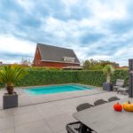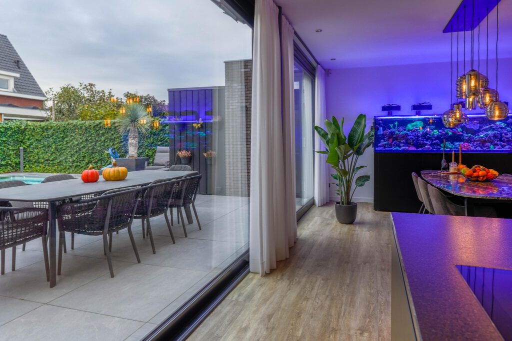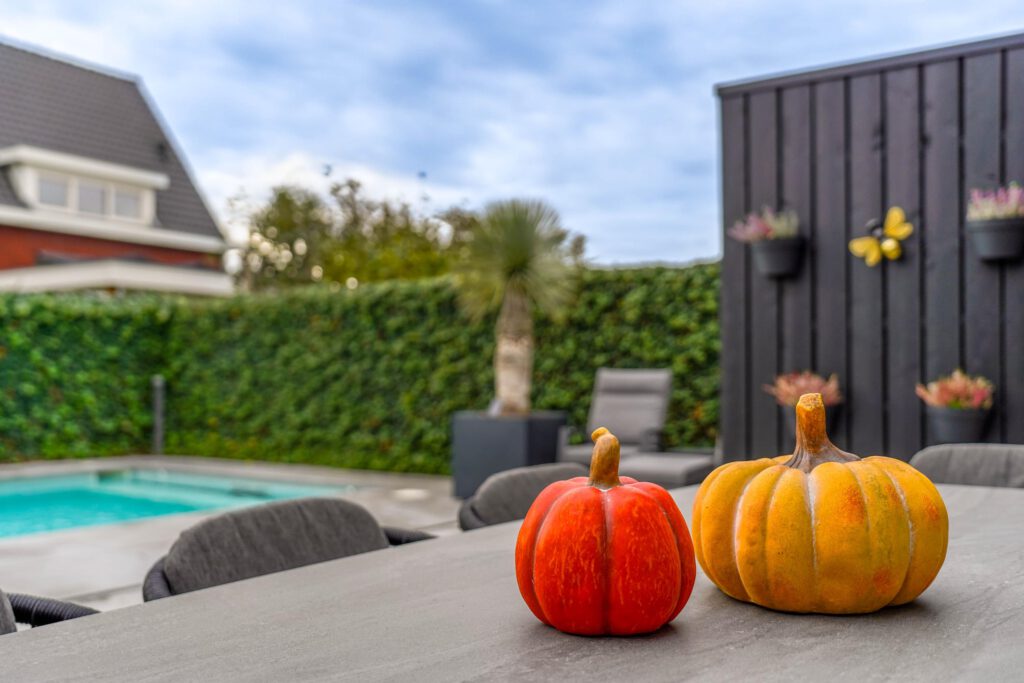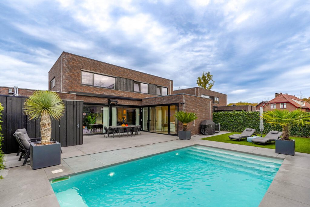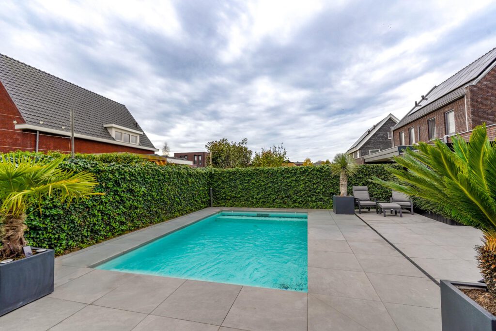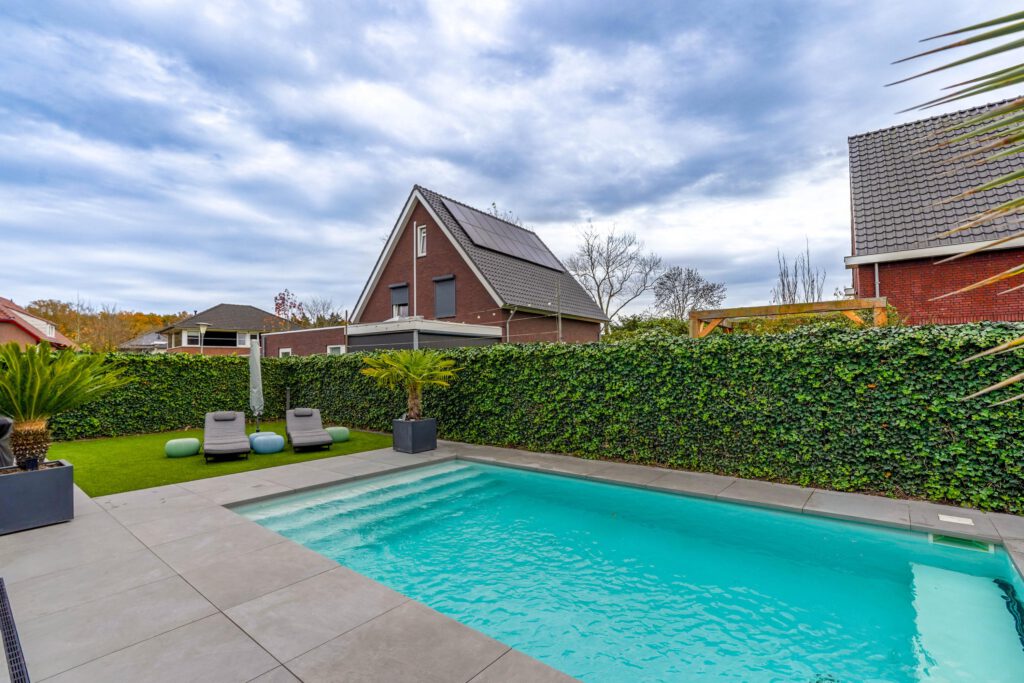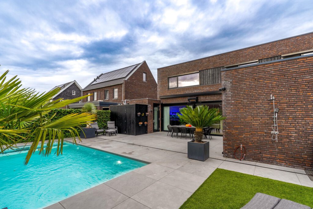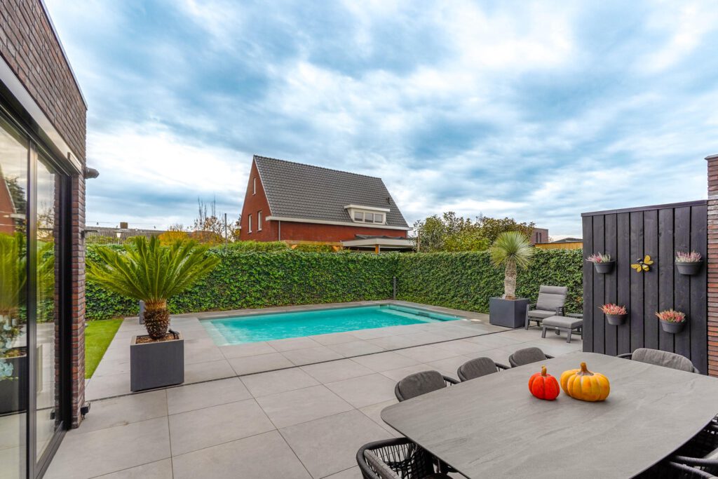 De tuin ligt op het zuidoosten, waardoor je vrijwel de hele dag profiteert van zon. Blikvanger is het luxe zwembad, compleet met verlichting en jetstream – ideaal voor ontspanning of een verkoelende duik op warme dagen. Aan de achterzijde ligt een ruim terras met voldoende plek voor een grote eettafel waar je heerlijk kunt tafelen, barbecueën en loungen. Vanuit de tuin heb je toegang tot de woning, de garage én een aparte berging voor tuingereedschap en zwembadbenodigdheden.