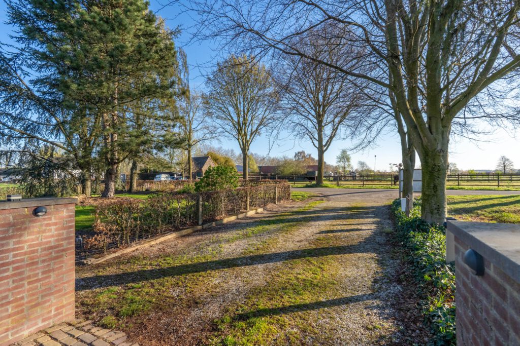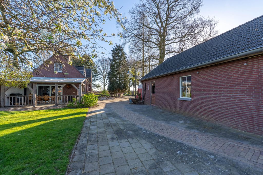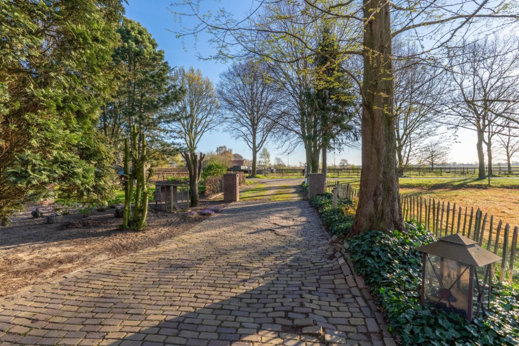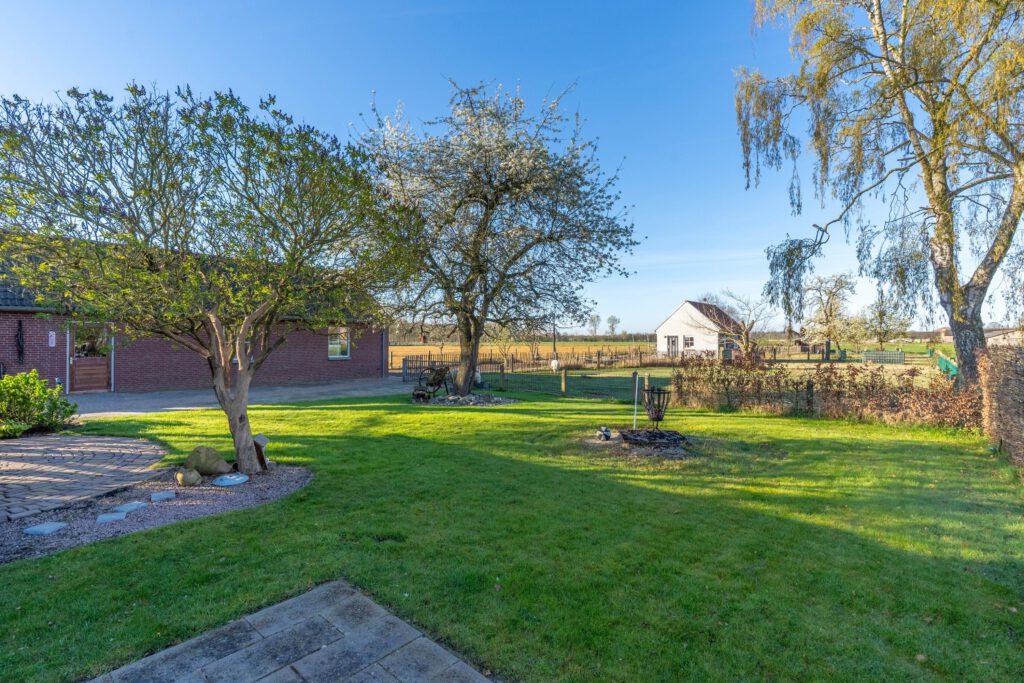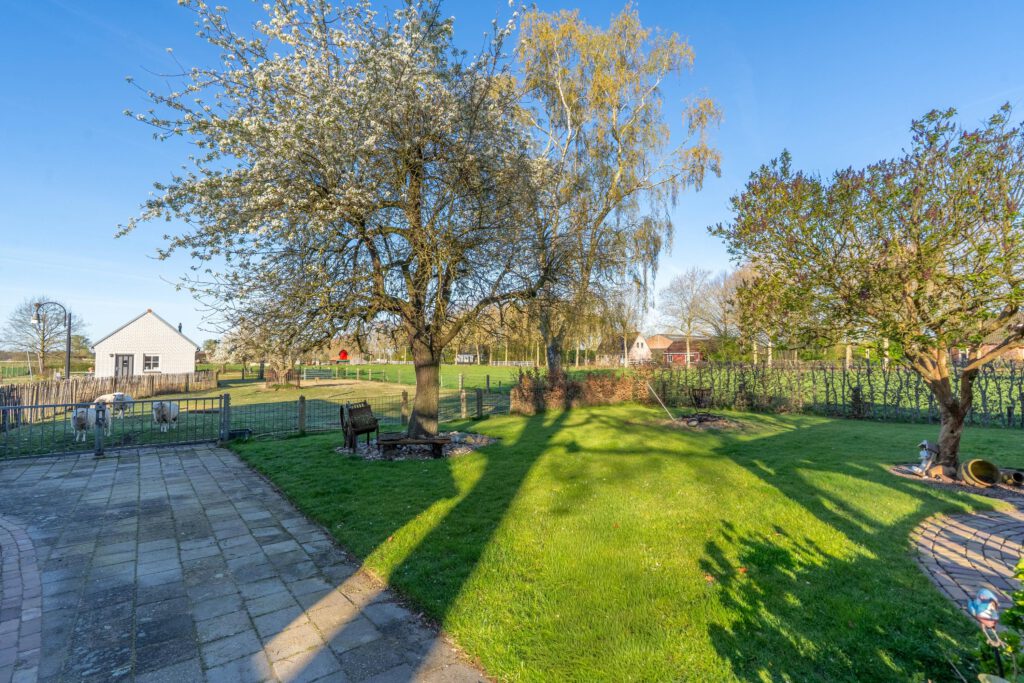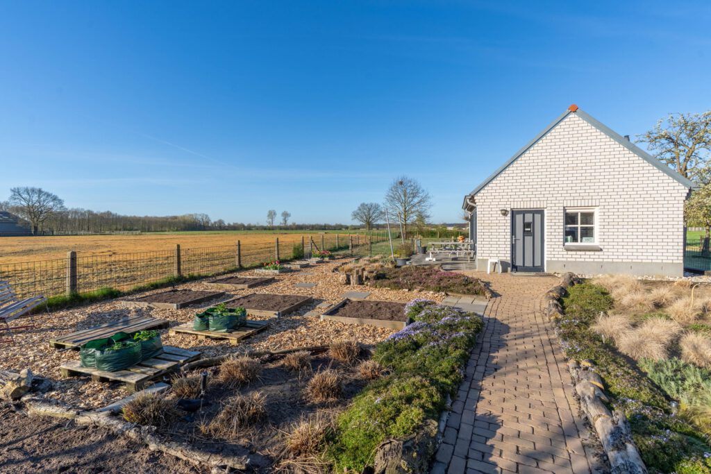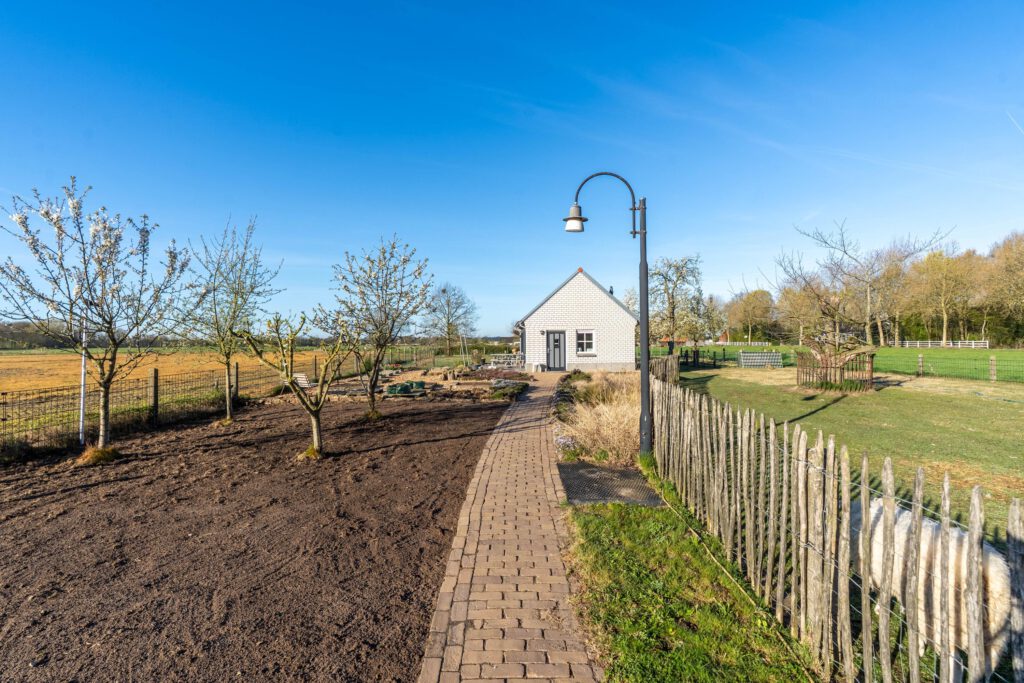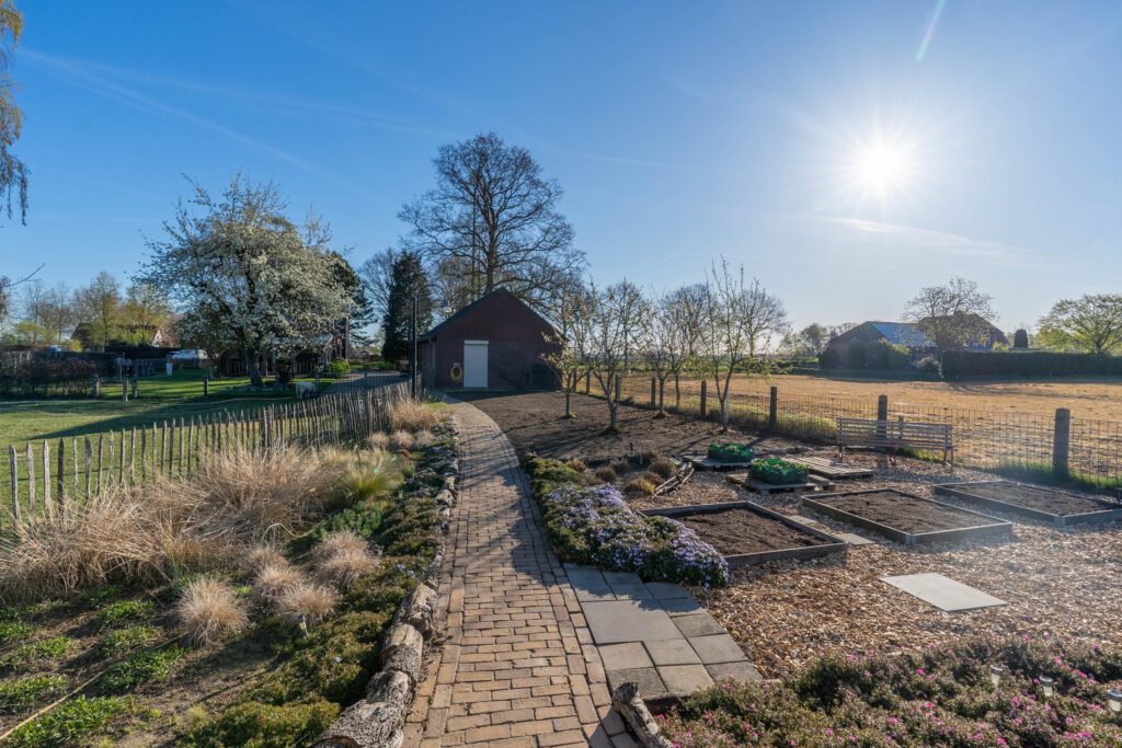 Via de grote oprit betreed je het perceel, met de woning centraal gelegen op het land. Hierdoor geniet je van een tuin rondom het huis en altijd een gevoel van ruimte en privacy. De tuin nodigt uit om elk seizoen buiten te leven – of je nu ontspant onder de overkapping aan de achterzijde van de woning, geniet van de zon op één van de vele zitplekken of bezig bent in je eigen moestuin.