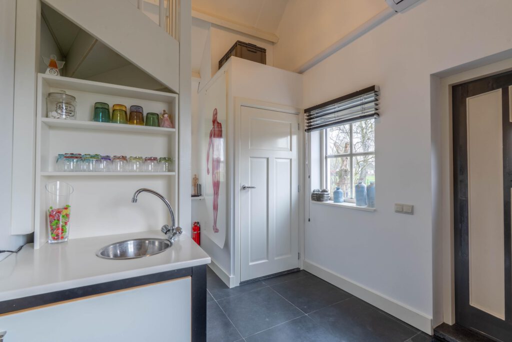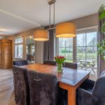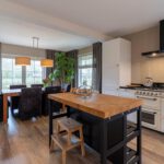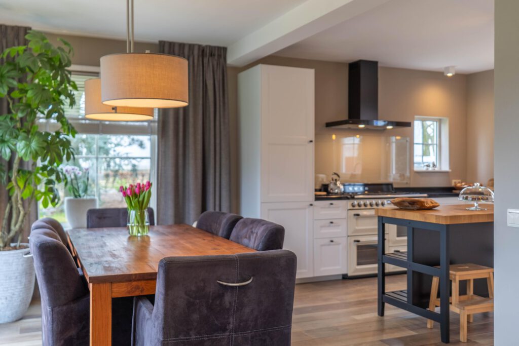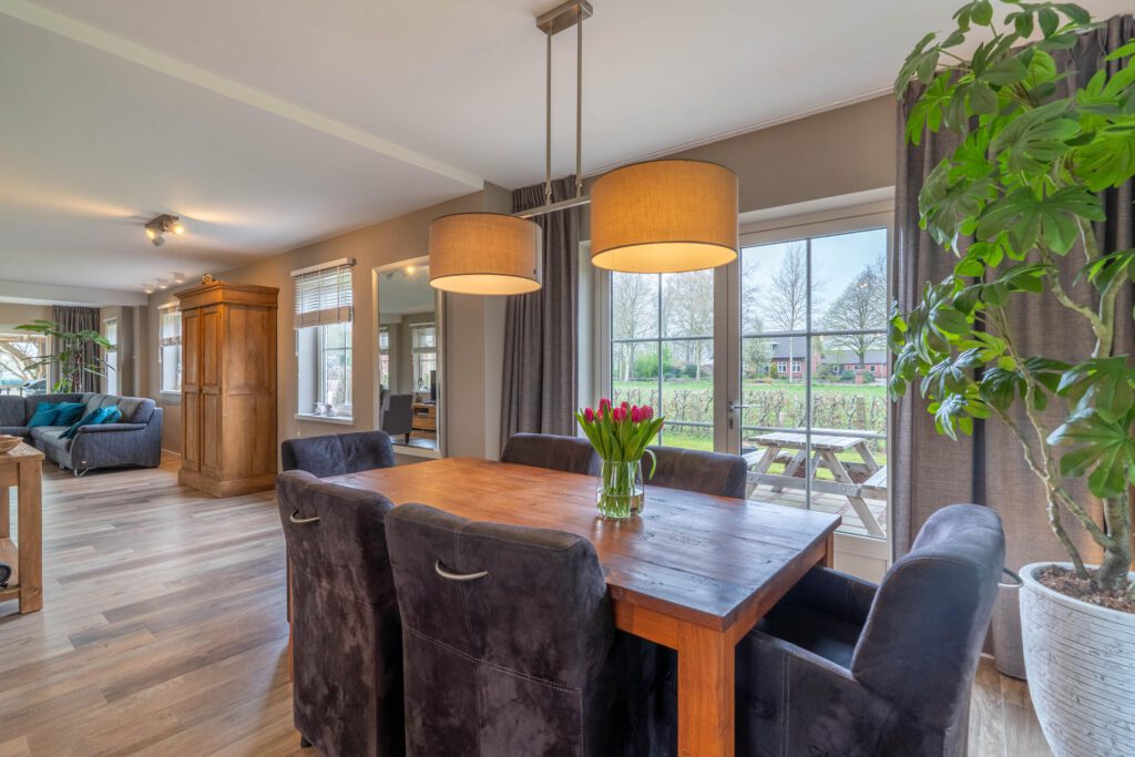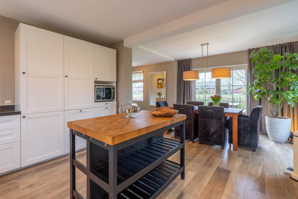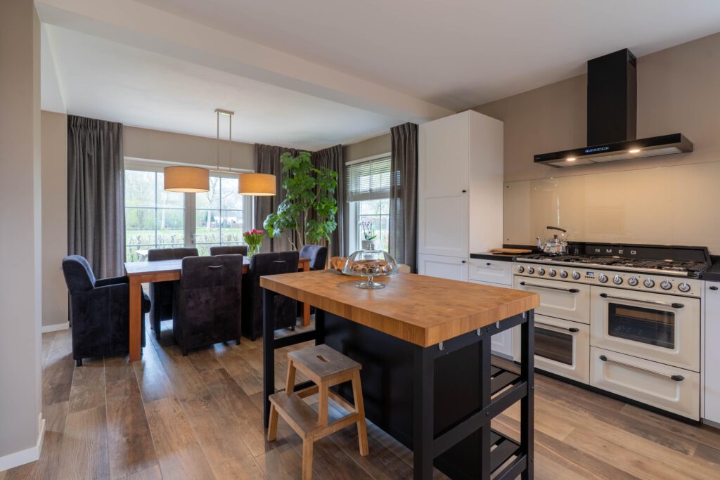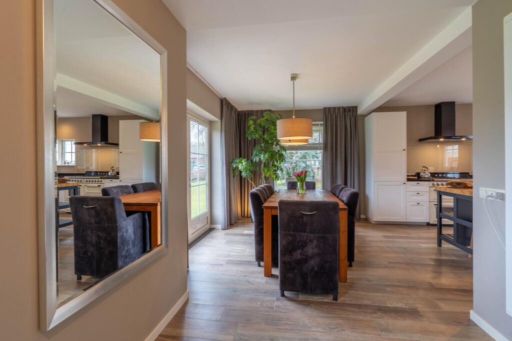 Het woonhuis beschikt over circa 144 m² woonoppervlakte. Je betreedt de woning via de zijkant en komt binnen in de entree, met toegang tot het toilet, de trapopgang en de open leefruimte. De open keuken vormt het hart van de woning: een riante, landelijke keuken die perfect past bij de sfeer van het huis. De keuken is uitgerust met een groot gasfornuis met dubbele oven, een vaatwasser en volop kastruimte. De eettafel is zo gepositioneerd dat je tijdens het eten prachtig wegkijkt over het eigen perceel. Via openslaande deuren heb je toegang tot een klein terras buiten.