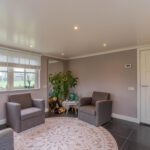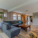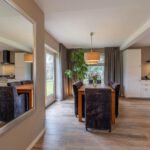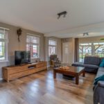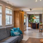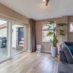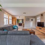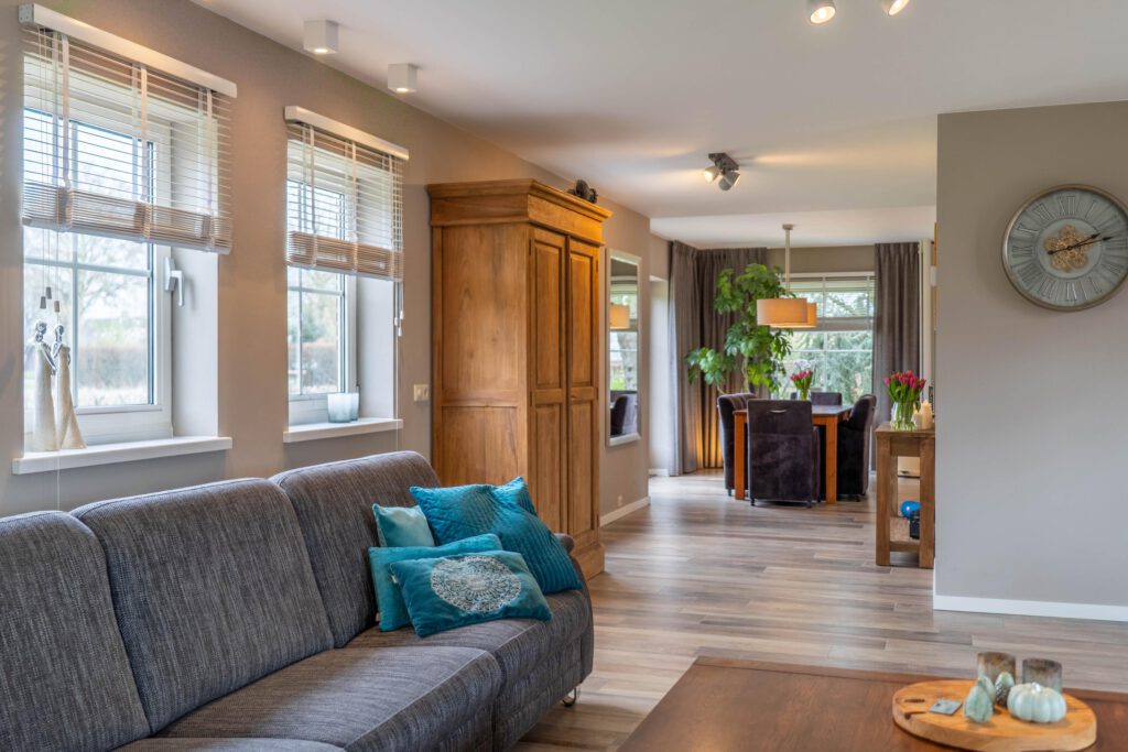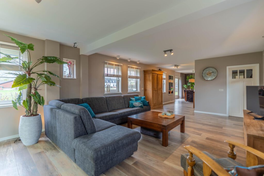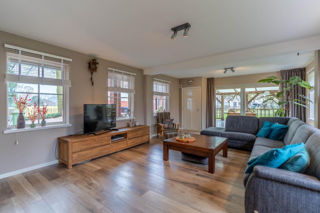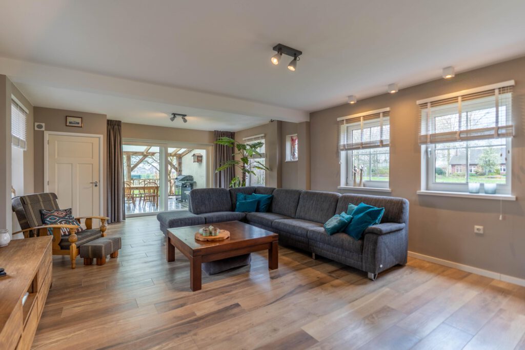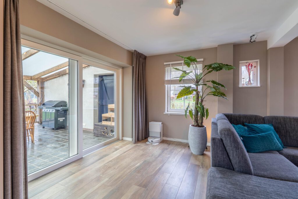 Aansluitend vind je de ruime en lichte woonkamer, een open ruimte met veel raampartijen die het buitengevoel naar binnen halen. Via de schuifpui bereik je de overkapping, waar je heerlijk beschut buiten kunt zitten, in elk seizoen.