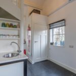 De ruime garage biedt volop plek voor het stallen van tuingereedschap, fietsen of kan worden ingericht als hobbyruimte. Verderop het perceel bevindt zich de grote moestuin met daar direct aan grenzend het bijgebouw van circa 97 m², geschikt voor uiteenlopende doeleinden zoals een praktijkruimte, atelier of gastenverblijf.
