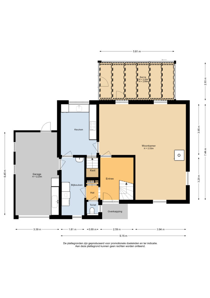 De hoge hal met dakraam en veel daglicht heet je welkom en geeft meteen een ruimtelijk gevoel. Vanuit hier zijn de woonkamer, eerste verdieping, toilet en bijkeuken bereikbaar. De woonkamer is licht en ruim, voorzien van een gezellige gaskachel voor koude dagen en een airco die in de zomer voor verkoeling zorgt. Vanuit de woonkamer stap je zo de serre in. De gesloten keuken is netjes afgewerkt en voorzien van een kookplaat, vaatwasser en oven, met uitzicht op de achtertuin. Vanuit de keuken zijn tevens een kleine bergkelder te betreden, ideaal als extra bergruimte voor voorraden. Aangrenzend bevindt zich de bijkeuken met witgoedaansluitingen en praktische opbergruimte. Vanuit hier heb je toegang tot de ruime garage, die bovendien beschikt over een smeerput.