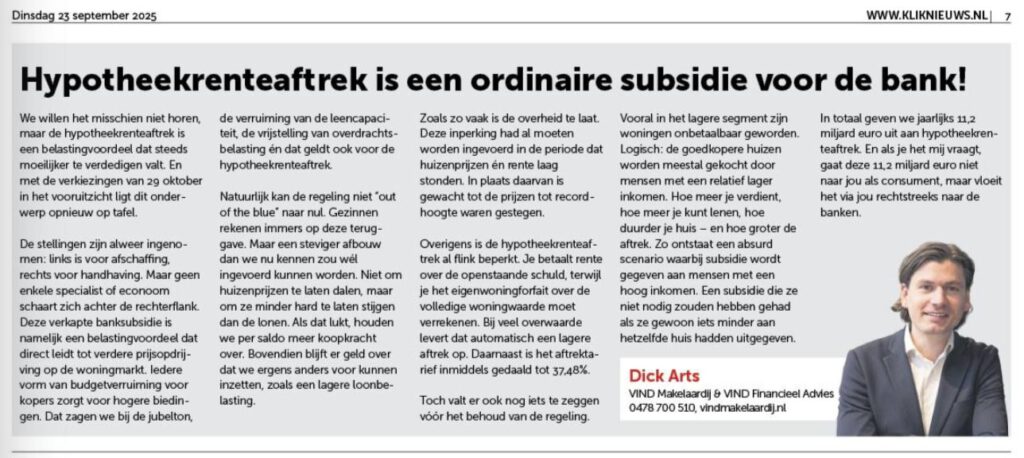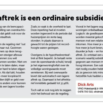 Natuurlijk kan de regeling niet “out of the blue” naar nul. Gezinnen rekenen immers op deze teruggave. Maar een steviger afbouw dan we nu kennen zou wél ingevoerd kunnen worden. Niet om huizenprijzen te laten dalen, maar om ze minder hard te laten stijgen dan de lonen. Als dat lukt, houden we per saldo meer koopkracht over. Bovendien blijft er geld over dat we ergens anders voor kunnen inzetten, zoals een lagere loonbelasting.